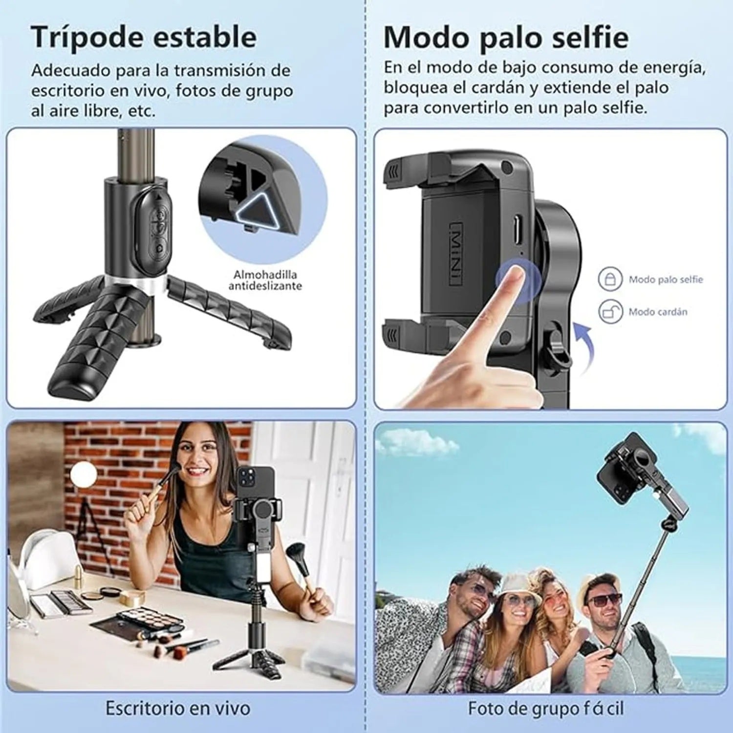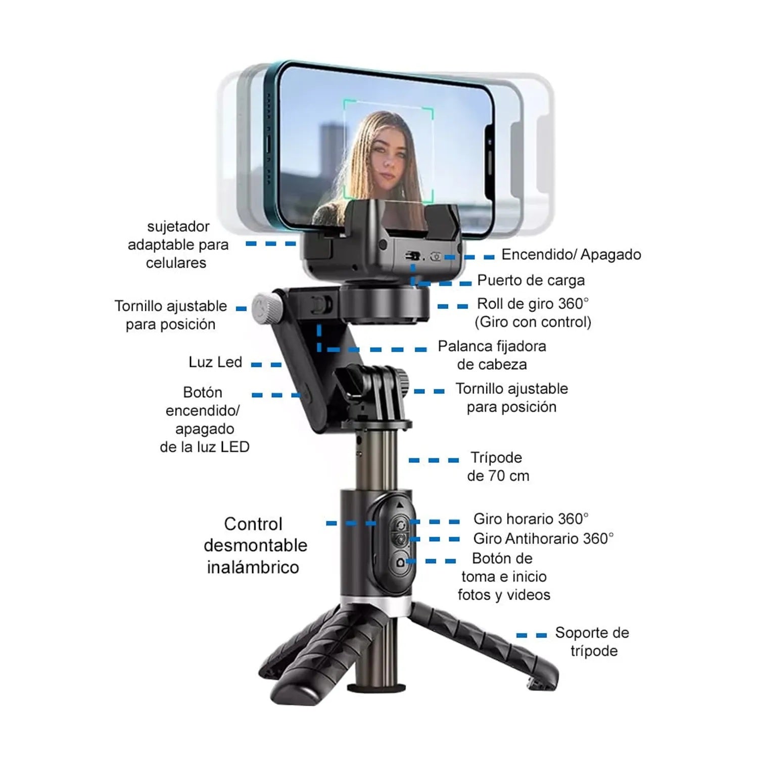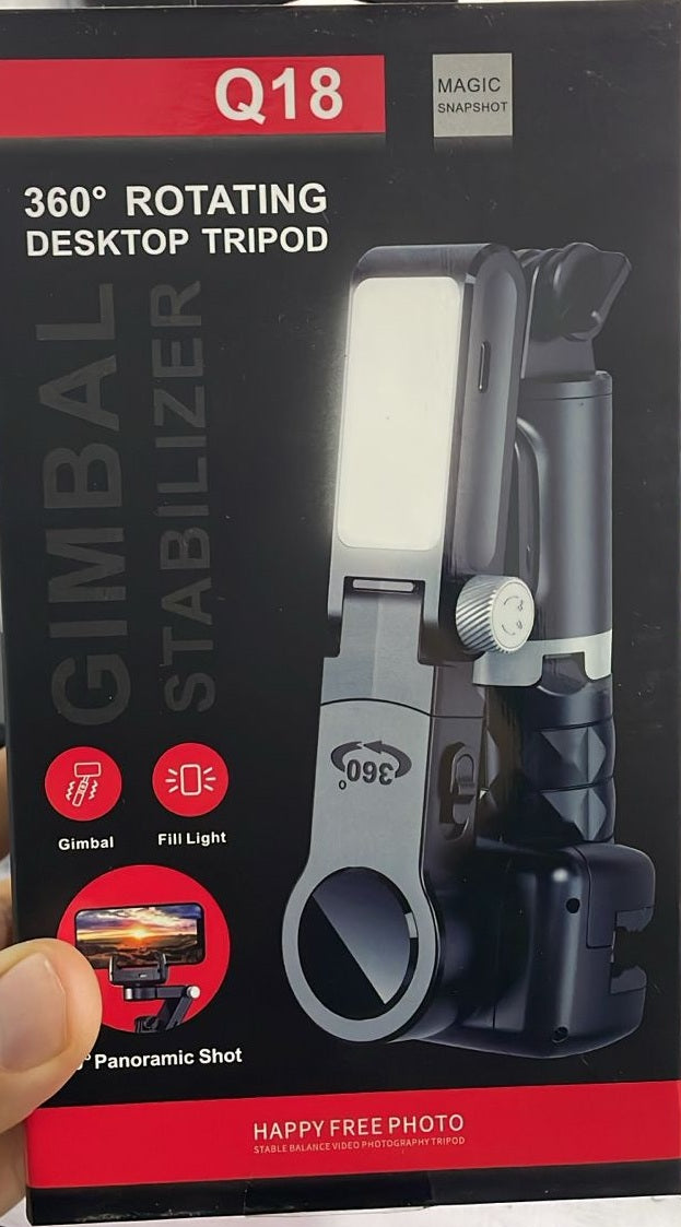 SOMOS GRUPO PUNTOTEC .A SU SERVICIO.😊MERCADO LÍDER GOLD -- TU COMPRA ESTÁ 100% PROTEGIDA 🥰 CONTAMOS CON TIENDA FISICA EMITIMOS BOLETA Y FACTURA ELECTRONICA DESPUES DE ENTREGAR SU PEDIDO. ENTREGAS A DOMICILIO LIMA METROPOLITANA ENVIOS A PROVINCIA AG SHALOM Y MARVISUR NUESTRO HORARIO DE ATENCIÓN: LUNES A SÁBADO: 9:30 AM - 6:30 Estabilizador Gimbal de Cardán 2 ejes Q18 recargable para celulares – Negro - Modelo: Q18 - Material: Aleación de Aluminio + ABS - Soporte de montaje: 43-84 mm (Gimbal) - Longitud extendida: 70 cm - Soporte: Trípode estabilizador - Ángulo de grabación: Giro con control de 360° (Horario- Anti horario) en diferentes posiciones - Control del ángulo de giro: Desde el control removible hasta distancias de 10 metros o desde el mismo cardán - Compatibilidad: Iphone 5.1 y superior y Android 4.4 y superior - Batería: 500 mAh - Duración de batería: 3 h dependiendo al uso - Conexión: Inalámbrico, descargue la app y conéctese a bluetooh para toma de fotos y videos desde el control (solo para el funcionamiento del botón toma de fotos o inicio de videos. Los movimientos horarios y anti horarios son independientes de la app y de bluetooh) - Modo de Iluminación: Luz Led recargable removible (Blanco, Semi-cálido y Cálido) - Niveles de Atenuación: Luz Blanco (3 niveles), Semi-cálido (3 niveles), Cálido (3 niveles) - Potencia de la luz Led Blanca: 6500K, Lumen: 40 LM, Potencia: 0.6 W - Potencia de la luz Led Cálida: 3000K, Lumen: 40 LM, Potencia: 0.6 W - Potencia de la luz Led Semi-Cálido: 4283K, Lumen: 60 LM, Potencia: 1.2 W - Corriente de entrada: 400 mAh -Crea posiciones de grabación profesionales con el cardán, mejora tu comodidad de grabación con buen nivel de iluminación y estabilizando movimientos bruscos con giros y posiciones de 360°, 260° y 180°, destaca de forma creativa tus videos, lives, presentaciones, entrevistas, vloggs con los diseños de grabación de la App y con el modelo de gimbal más recomendado para grabación de campo.