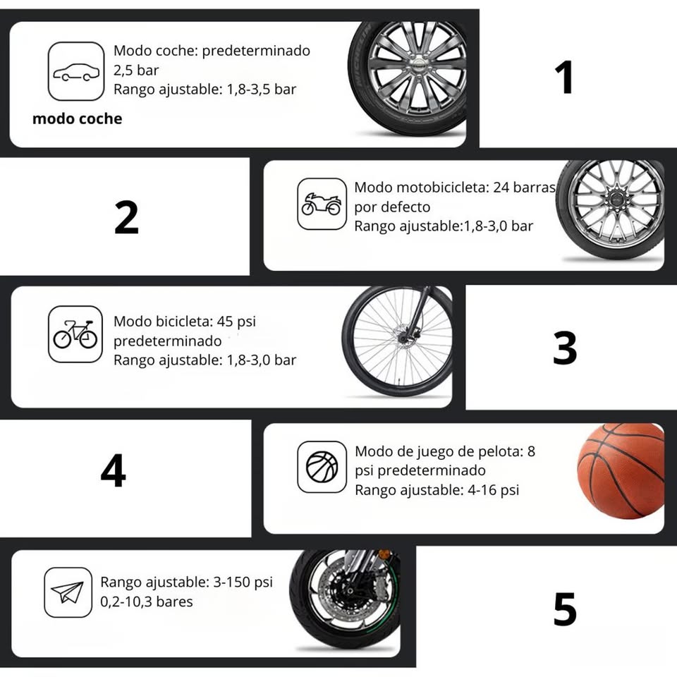 Inflador de Llanta SEISA AF-C05 – Compresor de Aire con Luz LED El inflador SEISA AF-C05 es una herramienta portátil y potente para inflar llantas de coche, moto, bicicleta y pelotas. Su pantalla digital permite monitorear la presión en tiempo real y su batería integrada permite un uso inalámbrico. También funciona como banco de energía para cargar dispositivos móviles. Características principales Presión máxima de 150 PSI Modos de inflado para diferentes vehículos y objetos Iluminación LED con función SOS Funciona de forma inalámbrica o con conexión al encendedor del auto Interfaz USB-A y Tipo C para carga de dispositivos Perfecto para carros, motocicleta, bicicleta y pelotas. Especificaciones técnicas Voltaje de trabajo: 7.4V Consumo máximo de energía: 60W Material: PC de alta resistencia Capacidad de batería: 1500mAh Inflación actual: 18L/Min Tiempo de carga: 3 horas Autonomía de uso: 15 minutos continuos Medidas del producto: 13 cm alto x 5 cm largo x 8 cm ancho Incluye Cable de encendedor de cigarrillos Cable de carga USB Boquillas de aire (4 unidades) Tubo inflable Diseñado para brindar seguridad y practicidad en cualquier situación.