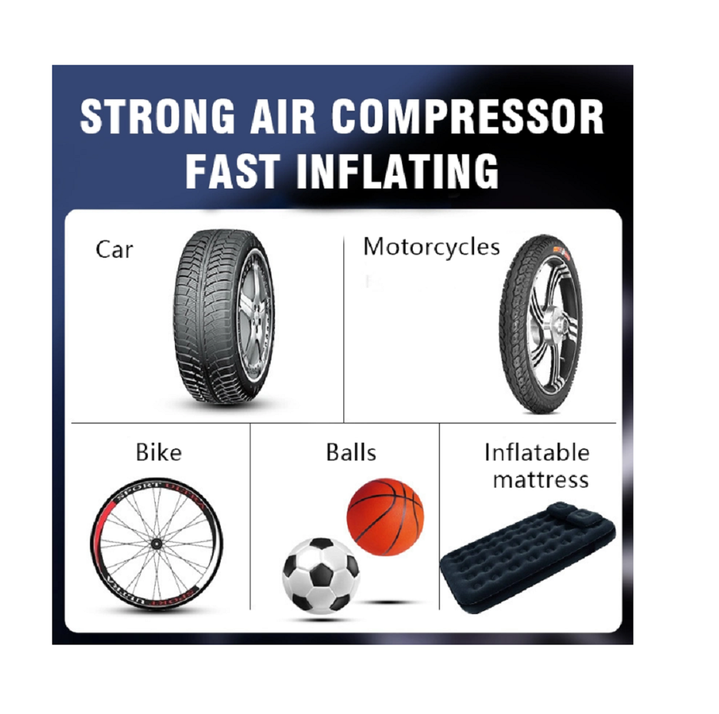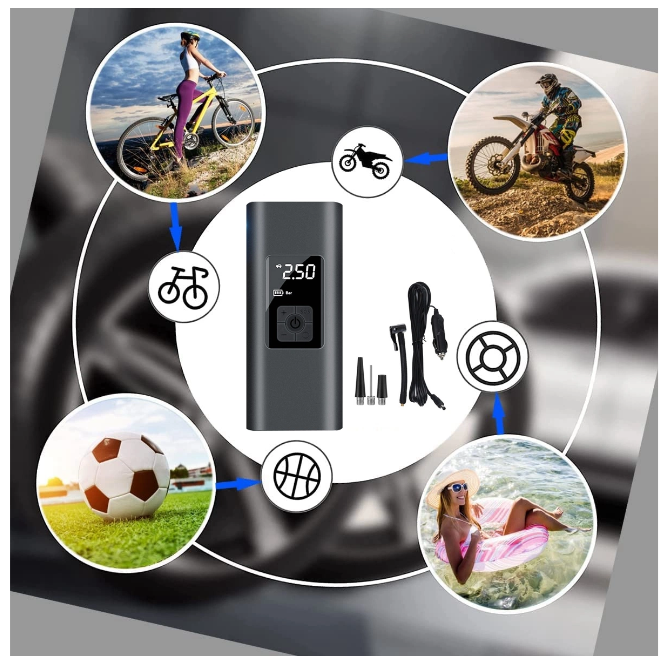 MINI COMPRESOR DE AIRE INFLADOR DE LLANTAS PORTATIL RECARGABLE 150PSI CARACTERISTICAS: Inalámbrico y portátil: el diseño inalámbrico y el tamaño pequeño compacto hacen que el compresor de aire sea portátil y fácil de operar con una sola mano. El compresor está listo en solo 4 pasos. Una pantalla LCD indica la presión del aire. Adecuado para inflar cuando los neumáticos del coche son insuficientes y totalmente inflados los neumáticos de bicicleta y motocicleta. Inflado rápido y automático: la bomba de aire eléctrica con 4 unidades de presión conmutables (PSI, BAR, KPA, KG / CM²), para que puedas ajustar la presión de los neumáticos como desees. El compresor se apaga automáticamente cuando se alcanza la presión establecida de los neumáticos. La presión máxima es de aproximadamente 150 PSI. Batería recargable de alta capacidad: con batería de iones de litio certificada de 2000 mAh x 3, este compresor portátil está listo para inflar bicicleta, pelota, etc. El puerto de carga tipo C soporta carga rápida. Uso por la noche: luces LED integradas que se pueden encender automáticamente y la pantalla trasera hacen que el mini compresor sea fácil de usar incluso por la noche. Multifuncional: este compresor de aire se suministra con 3 adaptadores de boquilla. Es posible inflar al lado de los neumáticos, también pelotas, colchones de aire, juguetes. ESPECIFICACIONES: Capacidad de la batería: 2000mAh*3 Eficiencia de inflado: 35-70 l/min. Presión de inflado:150PSI (Max) Unidades de presión: PSI, BAR, KPA, KG/CM2. Longitud exterior de la manguera de aire: 5.1 in ± 0.2 in. Temperatura de funcionamiento: -20 °C 60 °C. Tamaño: 173 x 69 x 51 mm. Peso: 550g. Múltiples usos diseñados para tu vida. Para neumáticos de coche/SUV/RV Para neumáticos de bicicleta/motocicleta. Para equipos deportivos. Para juguetes inflables. Nota: no apto para furgonetas, autocaravanas, camiones. CONTENIDO: 1 compresor de aire. 1 cargador para coche. 1 manguera de aire. 1 válvula Presta.