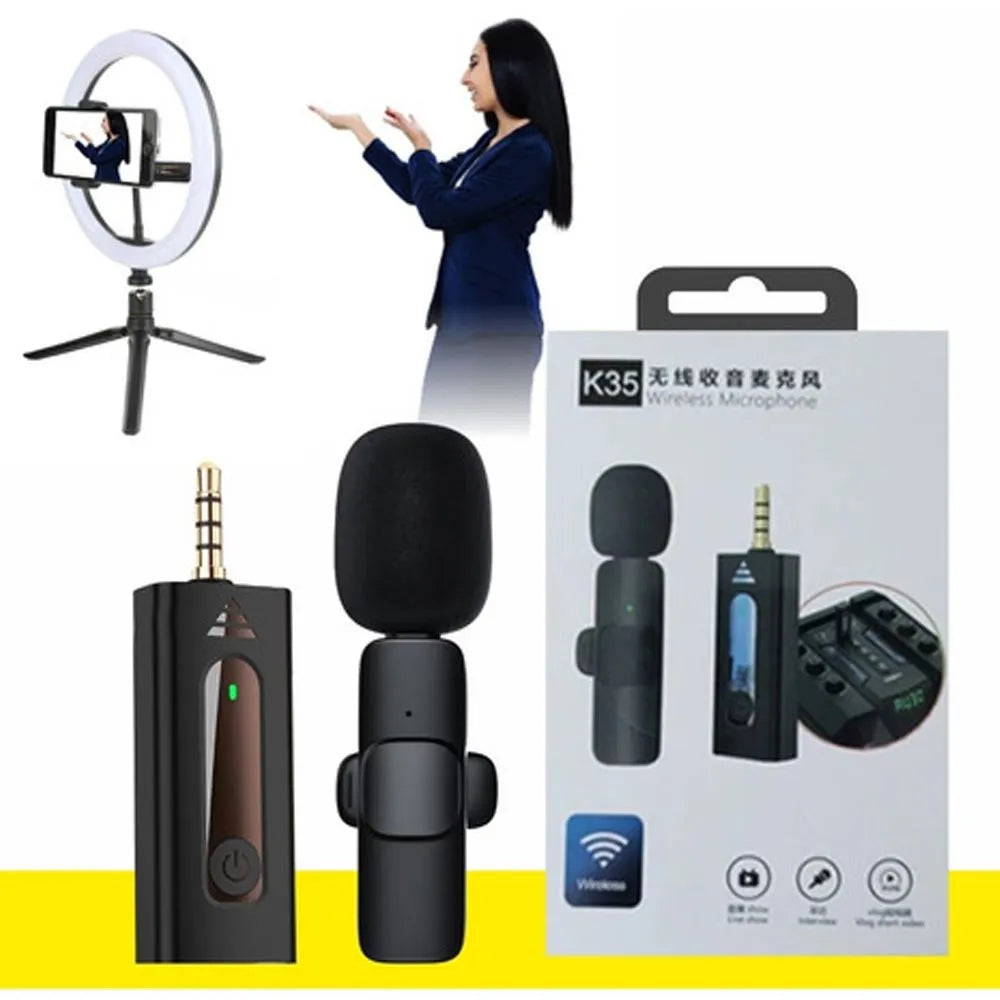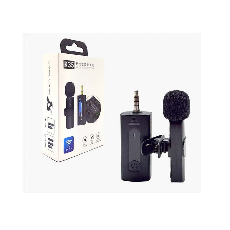 Micrófono inalámbrico para karaokes, entrevistas, conferencias ✔ Ideal para camaras DSRL, parlantes, consolas, tarjetas de sonido y demás equipos con entrada 3.5mm. Características: Modelo y SKU: K35 Función: Cancelación de ruido, ligero, portátil Patrón Polar: Omni-direccional Uso : Equipos de sonido, Cámara fotografica Comunicación: Inalámbrico Receptor: auxiliar 3.5mm Frecuencia: 20 KHz Distancia de transmisión: 20 metros sin paredes, 7m con paredes Duración de batería: 4 a 5 Horas SNR (relación señal-ruido): 65 dBm SPL máximo: 110db Sensibilidad: -42dB Puerto de carga: TYPE-C Compatibilidad: Compatible: Parlantes, Interfaces, Cámaras fotograficas,Pc, Tarjetas de Sonido Compatible: con celulares y PCs. Contenido: x1 Microfono de solapa x1 Receptor punta auxiliar 3.5mm x1 Cable tipo C para cargar