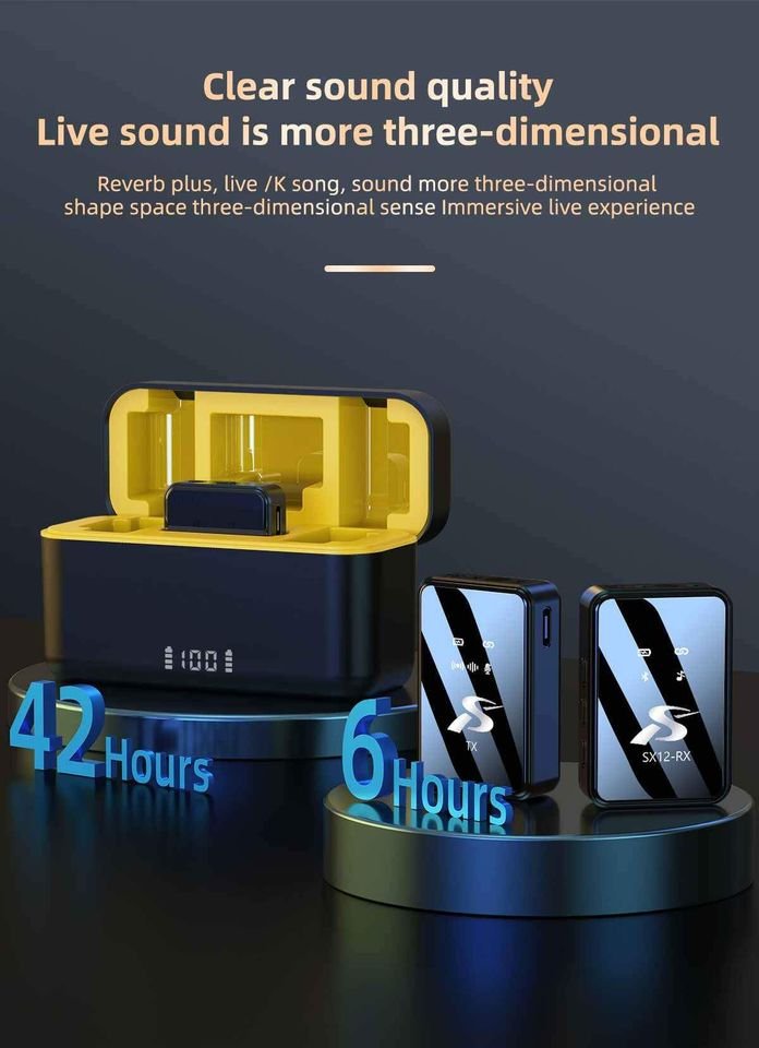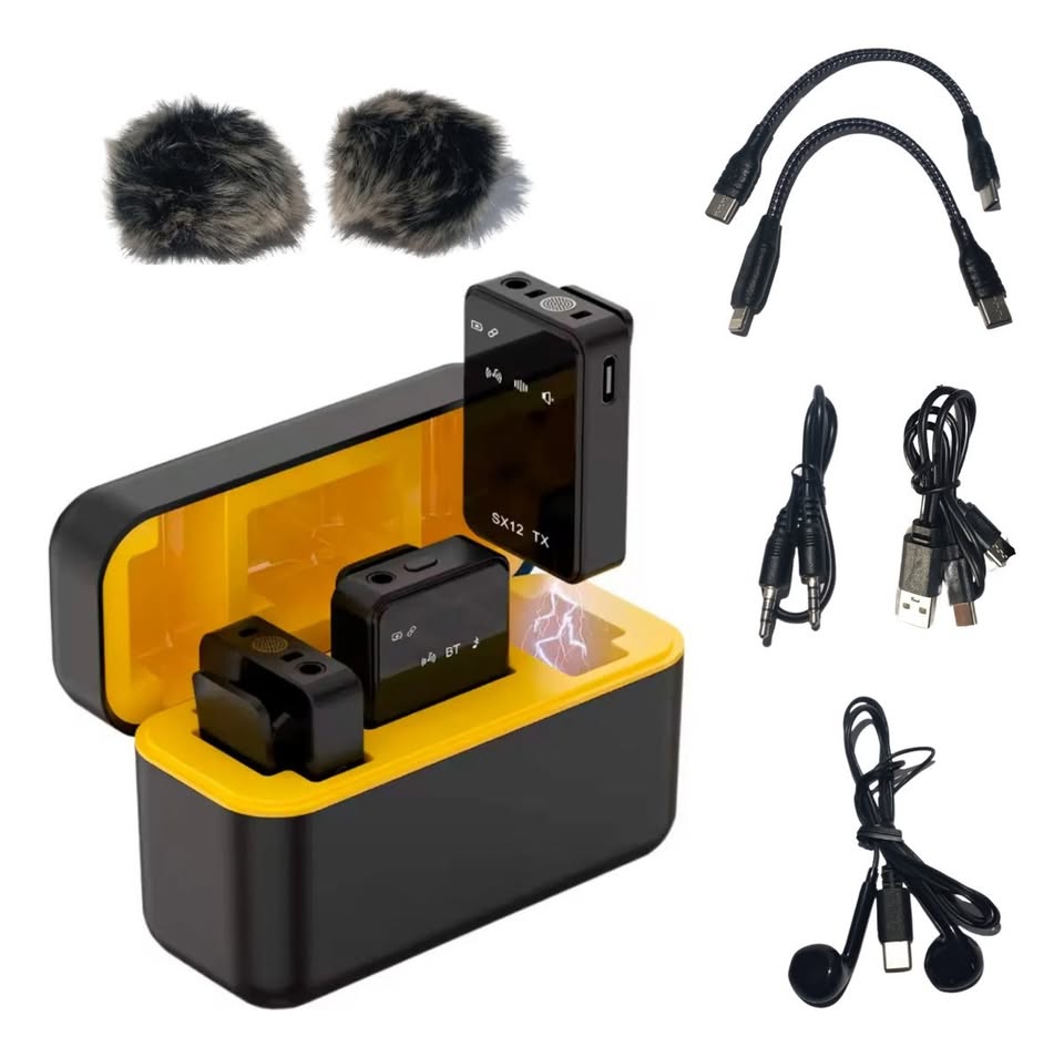 Modelo: SX12 con base de carga Conexión: Inalámbrico Frecuencia: 2.4 G Distancia de Trasmisión: 0 a 30 metros Patrón Polar: Omni-direccional 360° El SX12 llega evolucionando las referencias SX con su estuche recargable y sistema de carga magnética que provee hasta 3 cargas completas de los micrófonos y receptor, para un tiempo de trabajo de hasta 8 horas por carga. Este micrófono mantendrá una conexión inalámbrica fiable hasta 30 metros. Equipado con DSP interno que mejora notablemente la reducción de ruido y la claridad vocal. Además, incluye un efecto de reverberación ajustable, perfecto para añadir profundidad y espacio a tus grabaciones. En resumen, el SX63 es sinónimo de calidad sonora, portabilidad y facilidad de uso, convirtiéndose en un aliado indispensable para tus proyectos audiovisuales. Incluye filtro de viento para los 2 micrófonos, audífonos de monitoreo, cables para conexión de iPhone, dispositivos tipo C y cable 3.5mm. Mejorar las grabaciones de voz en equipos Tipo C (Android, Windows, entre otros), IOS (IPhone y IPad), Equipos con salida audio Jack 3.5 mm TRRS (Cámaras DSLR, PC, Laptops), su completo equipamiento permite usar los micrófonos en todos los equipos con salida de sonido. Permite mejorar la estética de las grabaciones adicionando desde el mismo micrófono música de acompañamiento durante las presentaciones en vivo o grabadas. -RECEPTOR- Un receptor (SX12-RX): El receptor sincroniza los micrófonos con los diferentes equipos de filmación o sonido, si necesita usar los micrófonos en equipos Android o Windows conecte el cable Android (Tipo C- Tipo C) (incluido) por uno de sus puertos Tipo C al puerto hembra del receptor SX63-RX y por el otro puerto Tipo C del cable al puerto hembra del celular, Tablet, laptop o dispositivo tipo C a usar. Para usar los micrófonos en equipo IOS conecte el cable IOS (Tipo C- IOS) (incluido) por su puerto Tipo C al puerto hembra del receptor SX12-RX y por el puerto IOS del cable al puerto hembra del iPhone o iPad. Para uso de los micrófonos en cámaras digitales, parlantes y equipos de sonido conecte el cable (Jack TRRS – Jack TRS) (incluido) por su puerto Jack TRRS al puerto hembra del receptor SX12-RX y por el puerto Jack TRS del cable al puerto hembra de la cámara digital (Sony, GoPro, Panasonic, entre otros) o equipo de sonido (parlantes, mezcladores de sonido, buffers, entre otros). Si necesitas usar los micrófonos en cámaras DSRL, PC, Laptops conecte el cable TRRS (incluido) por uno de sus puertos Jack TRRS al puerto hembra del receptor SX12-RX y por el otro puerto Jack TRRS del cable al puerto hembra de la cámara DSLR (Canon, Nikon, Conan, entre otros), PC o Laptop - TRANSMISORES - Contiene entradas Tipo C y Jack 3.5 mm puede elegir conectar audífonos Tipo C (incluido) o audífonos con punta Jack 3.5 mm, el uso de los audífonos permitirá controlar la salida de sonido y mejorar la técnica de grabación, sus botones de aumento y disminución de volumen activan las funciones del micrófono. *Funciones* - 30 metros aproximado de distancia para transmisión - DSP interno - Modo reverberación - Incluye audífonos para monitoreo - Carga magnética en estuche - Diseño elegante y lujoso *Características* - Respuesta de frecuencia de: 30Hz ~ 18KHz - Máximo SPL: 110 dB - Sensibilidad: -42db ± 3db - Micrófono de condensador - Patrón polar: Omni-direccional - Capacidad de la batería: 300MAH - Color: Negro - Tiempo de carga: 1.5 horas - Tiempo de trabajo: 5 a 8 horas °°°°°° CONTIENE °°°°°° 1x Caja de carga 2x Transmisor (Micrófono SX12) 1x Receptor 2x Protector de viento 1x Cable de carga 1x Cable tipo C 1x Cable Lightning 1x Cable Jack 3.5mm TRRS 1x Audífonos 1x Manual